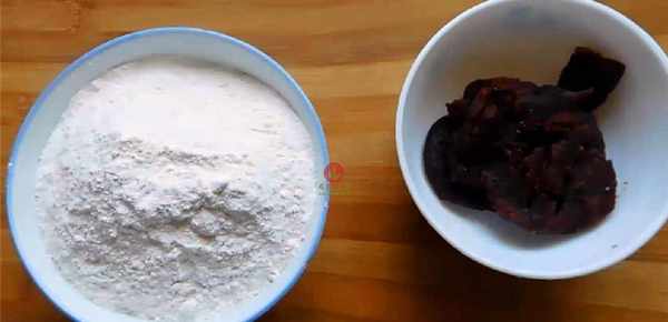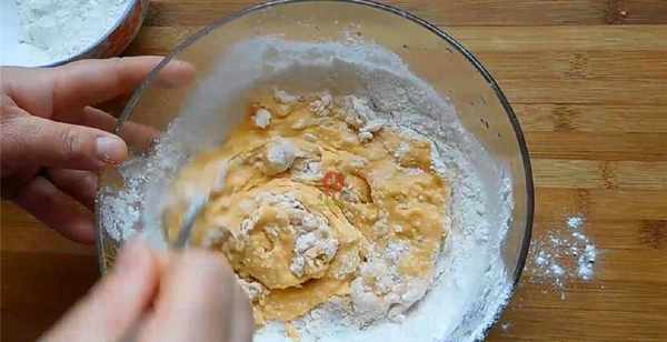 2;面粉倒入容器中不斷地攪拌均勻,和成面團