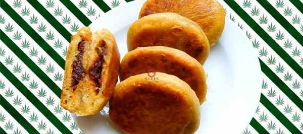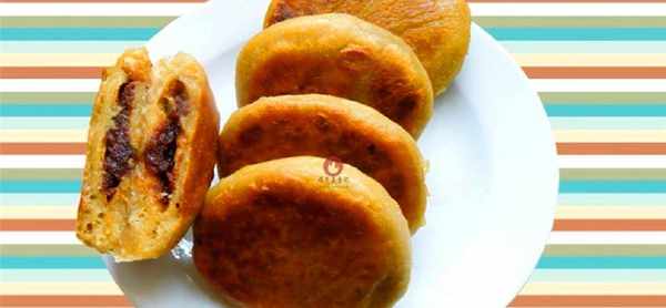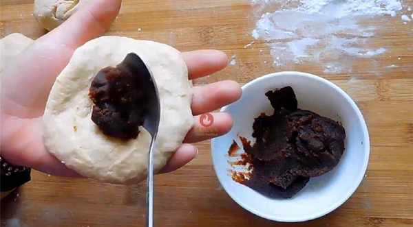 5;用手按扁放入適量的豆沙餡將口收緊壓扁