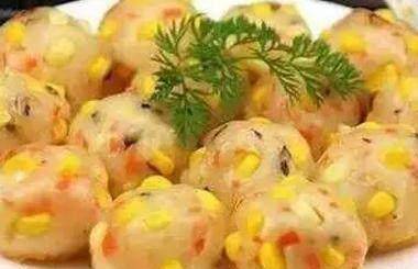 4、將團子外層粘上玉米粒,均勻擺在盤中,上鍋蒸約15分鐘。五顏六色的丸子做好啦。