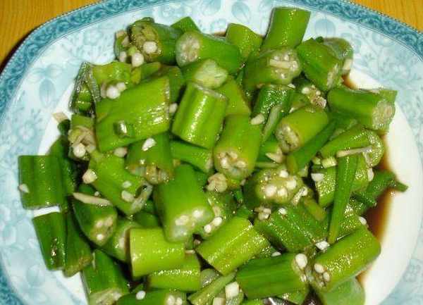 涼拌黃秋葵:黃秋葵洗凈切去蒂頭備用,鍋內放入適量的水開大火煮開。放入黃秋葵燒煮約3-5分鐘取出涼透。將黃秋葵切成1-2公分的斷,加入適量的胡椒粉、味精、白糖、醋、麻油、蔥花、蒜頭末拌勻即可。