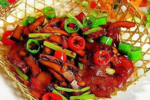 和味豆幹爆豬臉:豬臉肉切片、紅辣椒切成隨意狀。小蔥切碎、蒜切片備用。鍋裡倒少許油,燒熱。六七成熱就放入豆瓣醬,迅速炒開。放入豬臉肉,炒開。然後加入紅辣椒,翻炒均勻。加入蒜片和豆幹,倒少許醬油炒勻。最後加入小蔥炒勻即可出鍋咯,味道超級好。