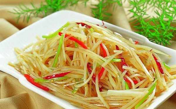 酸辣土豆絲:將土豆削皮,切成絲,用涼水沖洗瀝幹水分。將香菇、胡蘿卜、青椒洗凈切絲,用開水氽一下撈出。炒鍋放油燒熱,下入蔥花、薑絲爆鍋,倒入土豆絲煸炒至發軟。加入青椒、香菇、胡蘿卜、鹽、味、料酒稍加翻炒,用水淀粉勾薄芡,淋上熟油,出鍋即成,聞著特別香,吃著更香。