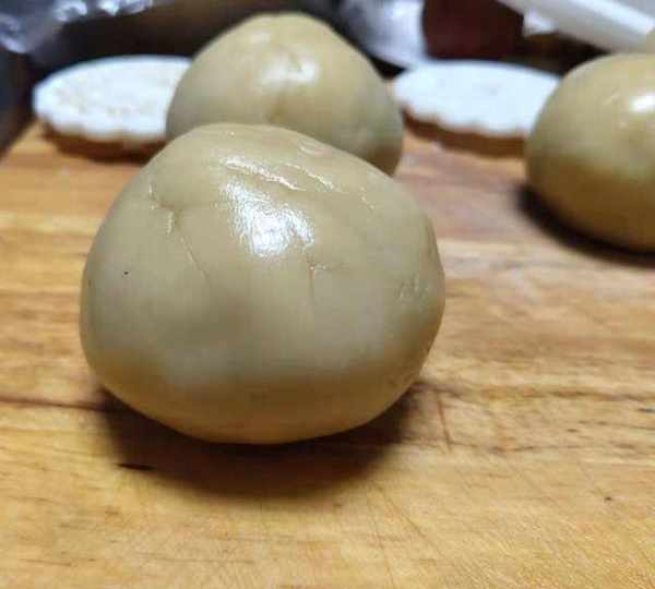 第3步、將豆沙壓扁蛋黃放在中間,將豆沙包裹住蛋黃,滾圓。餡料做好備用。