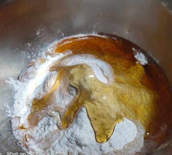 第4步、將轉化糖漿、色拉油倒入面包機內,加入梘水,加入面粉。