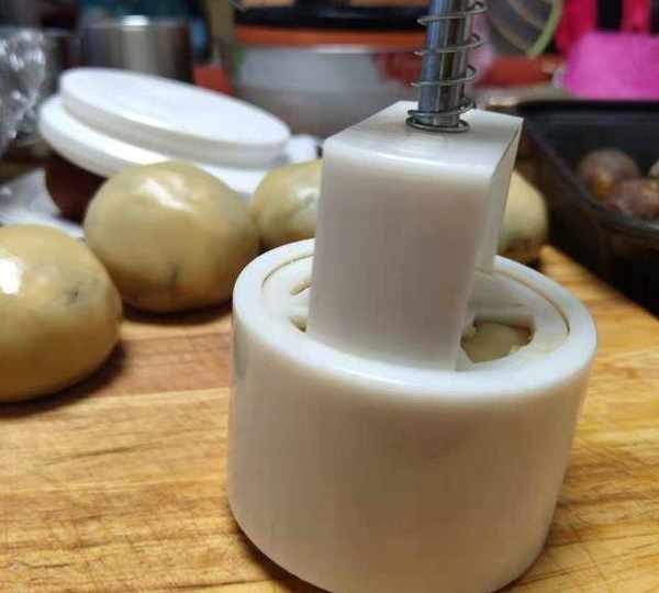 第8步、在模具裡均勻的撒上面粉,轉幾下再倒出多餘的粉,然後放入月餅坯。輕輕按下後,壓出月餅花紋,輕輕提起月餅模子。