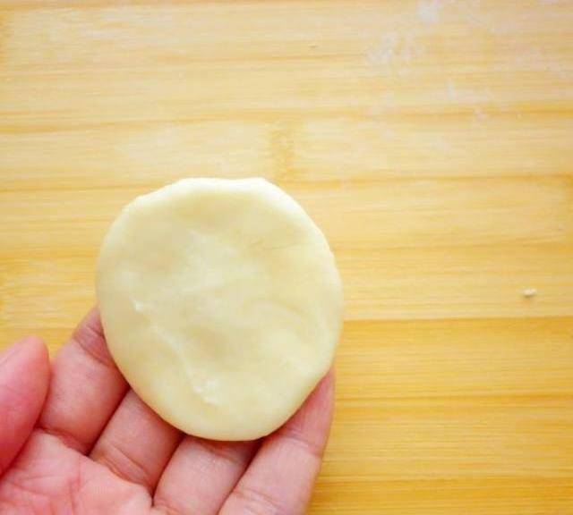 第7步、取一塊靜置好的水油皮面團,按扁成圓形。