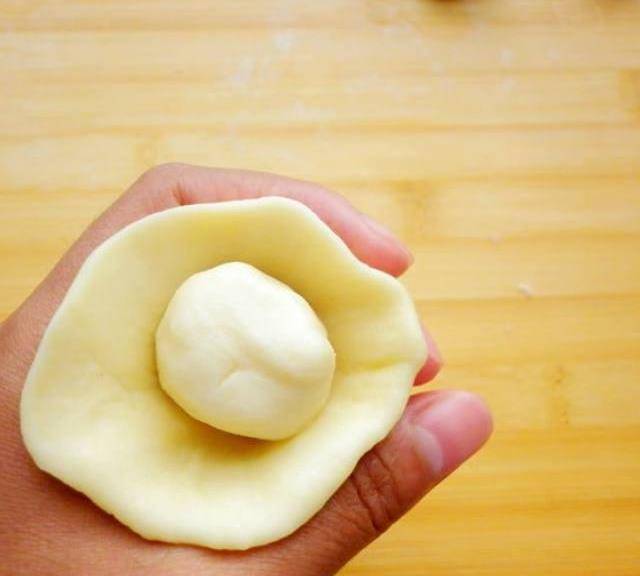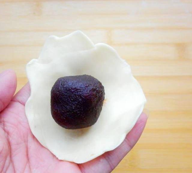 第14步、取一塊靜置松弛好的面團,搟開呈圓形,盡量搟成中間厚周圍薄。將一塊豆沙餡放在面團中間,包起來。