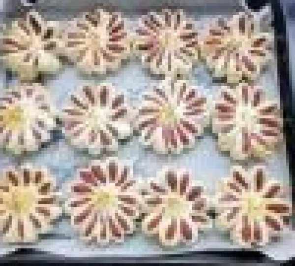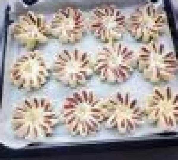 第18步、用同樣的方法將12個豆沙酥全部做好,擺在烤盤上。
