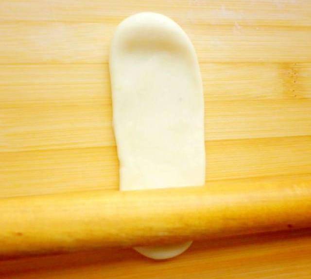 第10步、將包好的面團用搟面杖搟開呈長橢圓形。