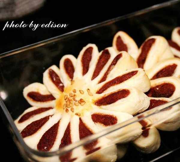 第19步、用指尖蘸少許蛋黃塗在豆沙酥的中心,在撒上少許芝麻做為裝飾。將烤盤放入預熱好200度的烤箱,烤15分鐘左右,至酥皮層次完全展開即可。