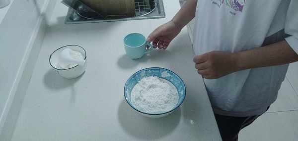 1.和面所需要的食材很簡單,隻需要(水)和(面)還有裝水和面的容器就可以啦!