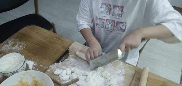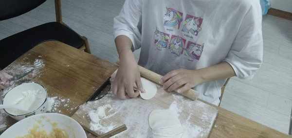 4.接下來就要把揉好的面團搓成一個長條,然後切成一個個小小的面團,然後再搟成一個個餃子皮嘍!