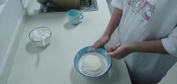 3.醒好面之後繼續揉它,直至面團光滑為止。(如果你覺得醒好的面團有點粘手,那麼我在這裡告訴你一個小秘密哦:在手上粘點面粉再去揉面團就不會再粘手瞭哦!)看:再次揉好的面團很光滑漂亮吧,就像醜小鴨變成白天鵝一樣呢!