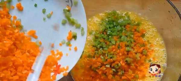 1;芹菜洗凈切粒,胡蘿卜切小丁