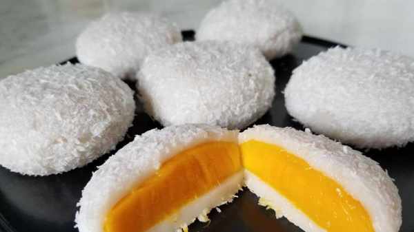 芒果糯米糍:芒果左右切開,用圖中圓模壓出芒果,所有材料攪勻過一次篩,將焗爐紙放上盆上。掃少許食油,倒一半份量糯米漿,大火蒸三分鐘,取出放涼,灑上手粉或椰絲..均勻塗滿皮面,反轉,撕開焗爐紙,用圓模壓出圓皮。芒果放上皮上,將另一塊皮放,沿邊按壓,這樣就完成瞭。
