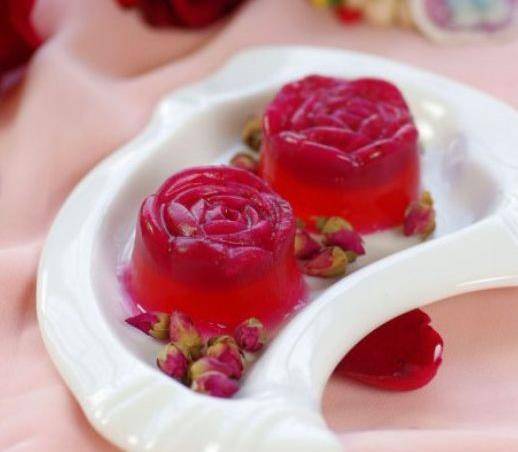 水晶玫瑰佈丁:瓊脂剪小段,用冷水浸泡至軟,玫瑰花沖入800ml開水,泡玫瑰茶湯待用,泡軟的瓊脂放入鍋中,加入泡好的玫瑰茶湯,加入適量玫瑰醬,小火加熱,一直攪拌至瓊脂完全融化,溫度稍降之後,將溶液倒入佈丁模具,送入冰箱冷藏定型,顏值超高。