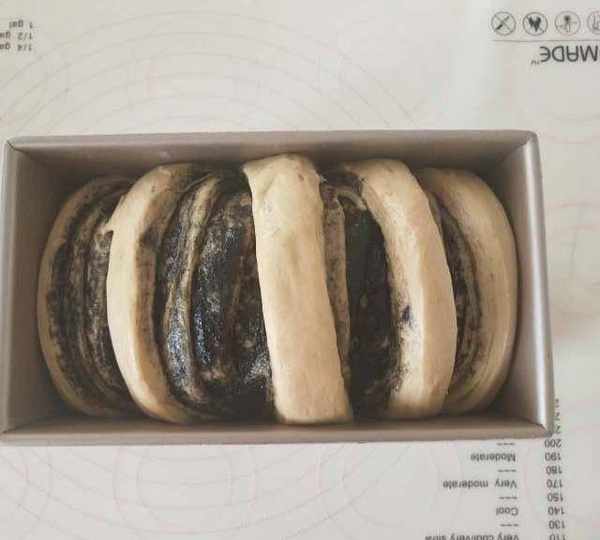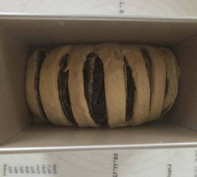 第11步、卷起,用鏟子輔助放入學廚土司盒中,烤箱32度進行二次發酵。