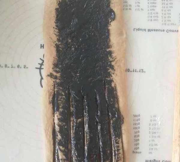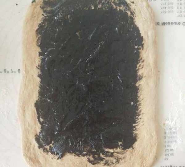 第7步、將面團搟成長方形,塗抹上黑芝麻醬。邊緣留白。