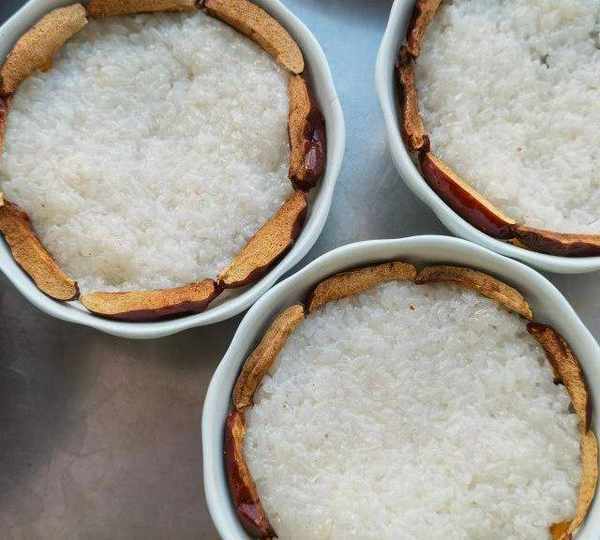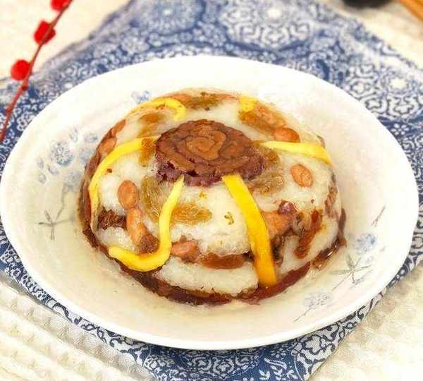 第8步、蒸好的八寶飯倒扣入盤中,淋適量糖桂花或者蜂蜜即可。