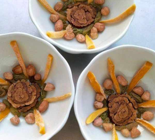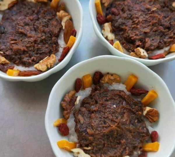 原料:糯米、幹果果幹、紅豆沙、玉米油、糖桂花、糖。