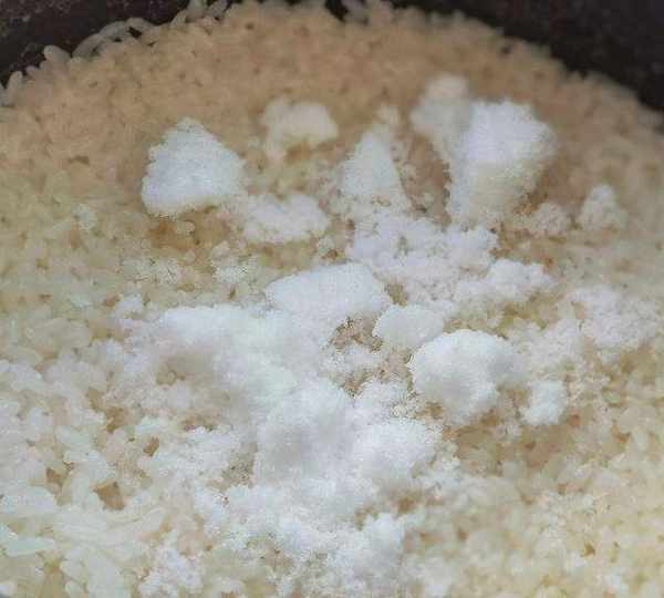 第1步、糯米提前浸泡一晚。泡好的糯米放入電飯煲,加入和米齊平的水,煮糯米飯。煮好的糯米飯裡放適量糖,拌勻備用。