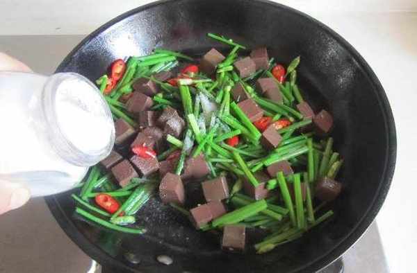 3.待韭菜苔翻炒變色後倒入鴨血塊以及適量的鹽炒勻即可。