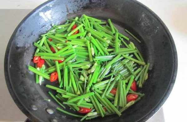 2.熱鍋倒油,倒辣椒炒香,隨後倒進韭菜苔進去翻炒;