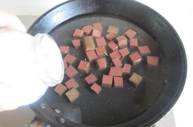 1.熱鍋加水燒開,加入適量鹽,倒入切成小塊的鴨血焯水;