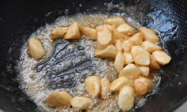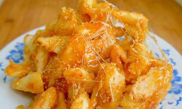 3、架鍋倒入多量的食用油,等油溫升至6成熟時,將山藥下鍋翻炸一遍,撈出控油,然後鍋裡留點底油就好,挖一大勺白糖加進去,炒化後,將山藥倒進鍋裡,裹上糖液,這樣一盤拔絲山藥就做好啦。