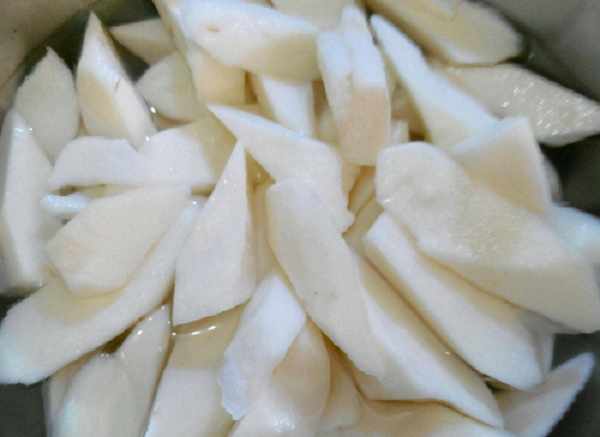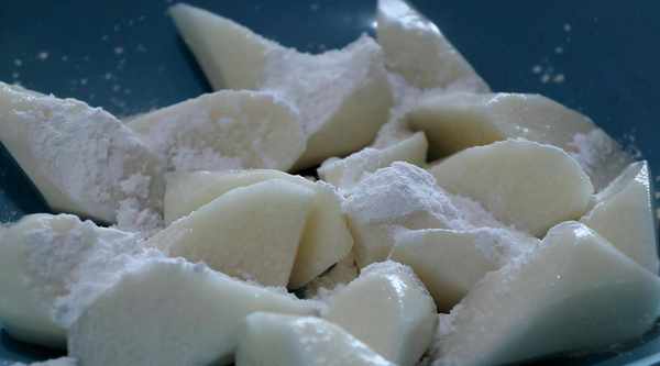 2、架鍋添水,等水燒開後我們把山藥塊丟進去,下鍋焯一下水,大約5分鐘的樣子即可撈出裝盆,放涼之後,往盆裡加入適量的淀粉,使得每塊山藥均勻地沾上淀粉。