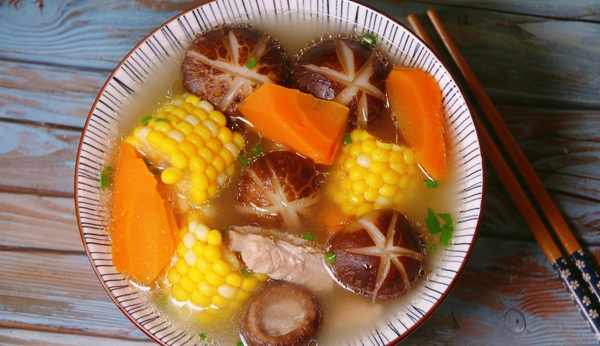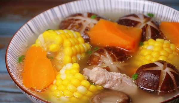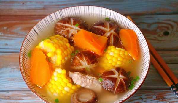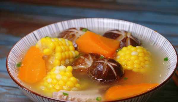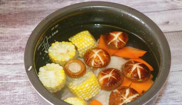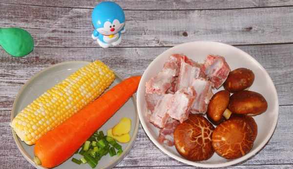 食材:排骨 400g、香菇 6個、胡蘿卜 1根、玉米 1根、薑 1塊、蔥 1根 鹽適量