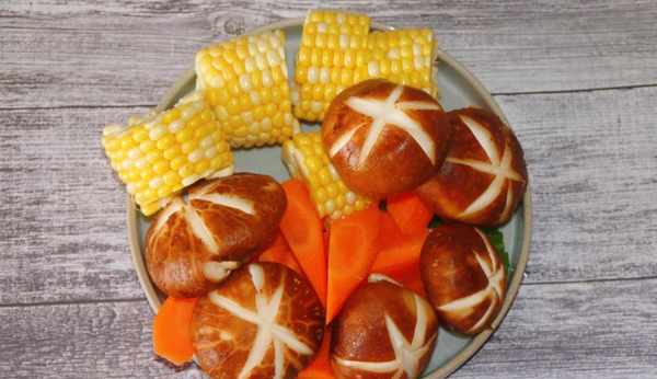 2:胡蘿卜去皮切滾刀塊,玉米切斷,薑去皮切片,香菇洗凈切花刀