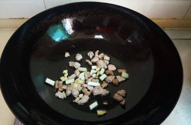 7、將肉煸炒至變色出香味,然後將蔥、薑和大蒜放入鍋中炒出香味;