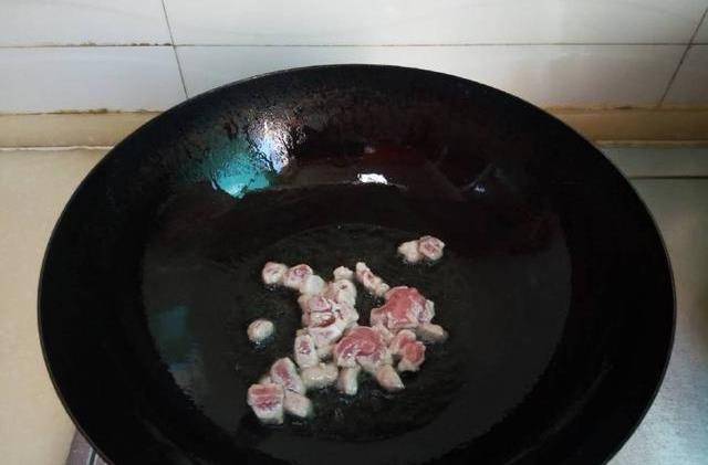 6、熱鍋放油,油熱後將豬肉放入鍋中;