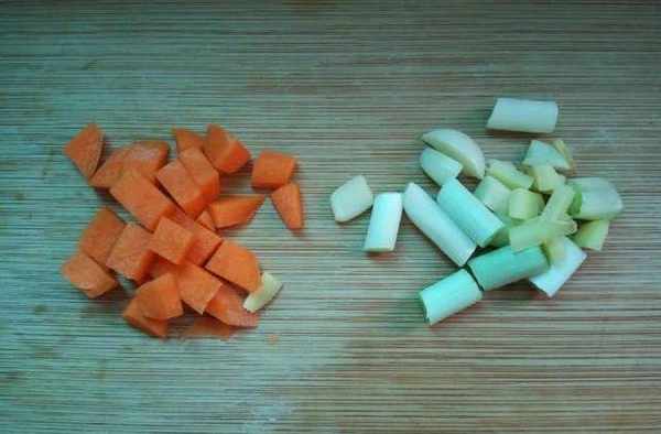 4、將胡蘿卜切丁,蔥、薑和大蒜切小丁狀;