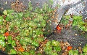 準備好原材料。熱鍋涼油, 放入肉末進去煸炒。煸炒變色後加入薑末進去翻炒。加入豆角丁進去翻炒。豆角丁翻炒至九成熟時加入鹽調味。再加入紅椒翻炒兩下。最後加入水淀粉勾芡, 盛入盤中。