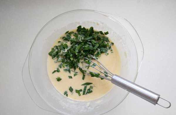 3、然後再加入切碎的韭菜,再次攪拌均勻。