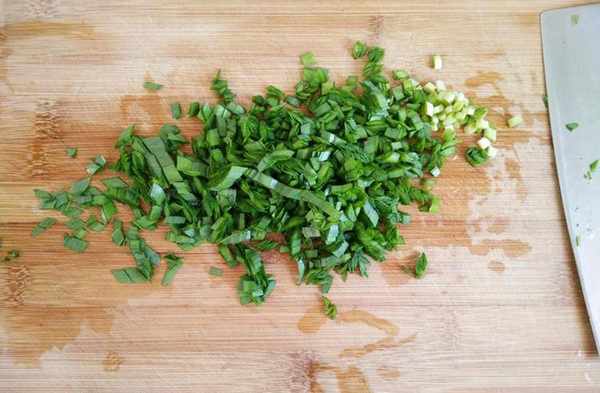 1、韭菜一小把清洗幹凈後切碎,如果做的比較多的話,韭菜可以頭一天晚上睡覺之前清洗好,切好放入冰箱冷藏,這樣早起更省事瞭。