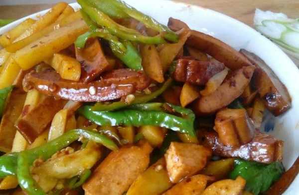 土豆炒豆幹:土豆去皮,切成條,豆幹切條,青椒切絲。熱鍋涼油,放入辣椒醬炒出香味,放入豆幹條慢慢煸炒一兩分鐘。放入土豆條翻炒幾下,放入蠔油、花椒粉,烹入多半碗開水,改小火,便於入味。土豆條八成熟時放鹽,放入青椒絲,翻炒出鍋,就是這麼簡單。