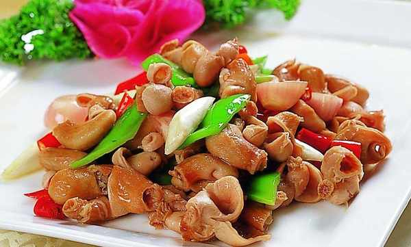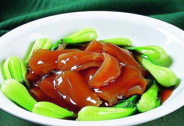 紅燜裙邊:將新鮮裙邊切成長方塊,用開水氽透,撈出;火腿切成長方塊,油菜心開水氽透。鍋內加入雞湯和裙邊,火腿片放在上面,再下入蔥、薑等調料,先用大火燒開,然後用小火煨。待裙邊爛後,挑出蔥、薑,兌好口味,用水淀粉勾薄芡,澆上雞油,盛入盤內。最後鍋內加入雞湯,上火燒開,加入鹽、芝麻油、胡椒面,放入菜心,把菜心燒酥後,撈出,圍在裙邊的周圍,撒上芝麻,即可。真的是非常的爽滑,值得一試。