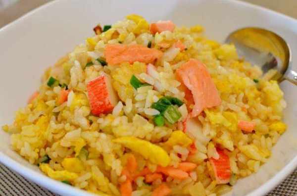 三文魚炒飯:先炒熟一粒雞蛋。裝起,暫放一邊。熱鍋,炒香蒜茸和洋蔥,放入冷飯拌勻。打開另外1粒雞蛋,攪拌後倒在飯上面,不要動,稍微煮1分鐘,雞蛋有點硬瞭再翻面煮熟另外一面雞蛋。這時翻炒蛋飯,要不斷攪拌,這樣雞蛋就會慢慢包住飯粒。將其它料、蟹柳、三文魚等全部拌入翻炒。調味:放鹽、雞粉,加入蔥花稍微一兜,即可上桌品嘗美味的食物。