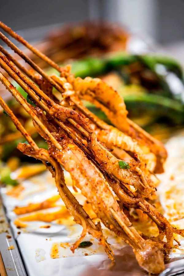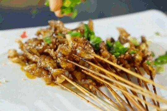 最絕的還是宜賓人對豬頭的處理,從鼻到口再到喉,每一個宜賓燒烤師傅都是擅長解“豬”的庖丁。牙梗是豬的上顎軟骨,外形很像一階階的梯子,也被稱為豬天梯,口感脆硬,嘎吱嘎吱嚼起來十分脆爽。花心是豬咽喉部位,切成三角形穿起來,脆脆的口感,特別有嚼頭。
