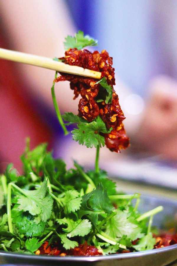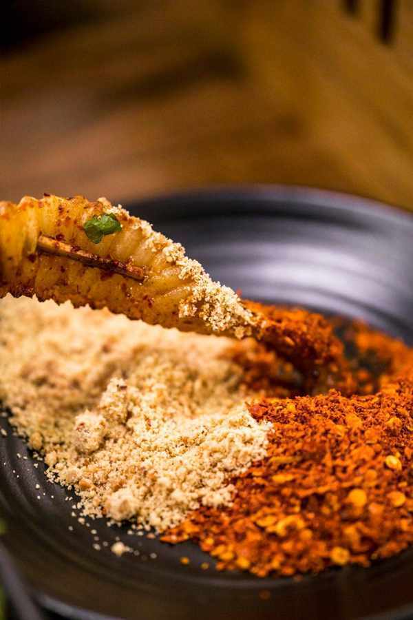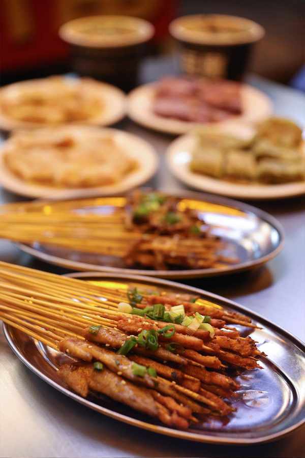 烤好臨上桌前,還要撒上大把的調味料,先撒海椒,再撒蔥花,吃之前要蘸蘸料,蘸料有幹辣椒粉,花生黃豆面和醋碟三種,一根根烤串,層層疊加的醬料,不再是單純的燒烤,而是重調味的川菜的縮影。