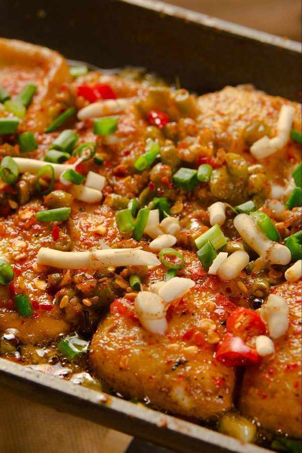 包漿豆腐外焦裡嫩,烤熟後一個個脹鼓鼓黃燦燦,混合著小米辣、折耳根的調味,咬一口內裡無粗糙感的豆腐在舌尖瞬間爆漿。來自雲南的小土豆可以切成塊來烤,也可以切成片來炸,是宜賓深夜裡的碳水爆炸。