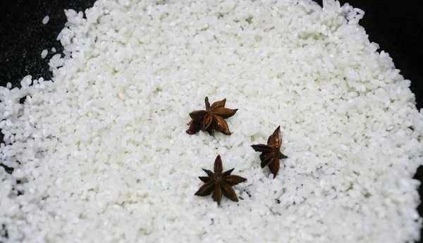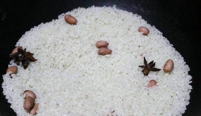 2、煤氣灶開火,倒入瀝幹水分的大米小火慢慢翻炒,待水份快炒幹時,丟入八角繼續翻炒