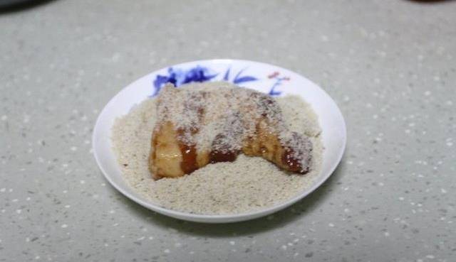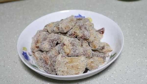 10、肉醃制好後,用筷子夾起來放入裝有米粉的小碟中,讓每片肉都均勻地裹上米粉