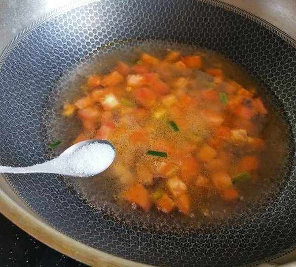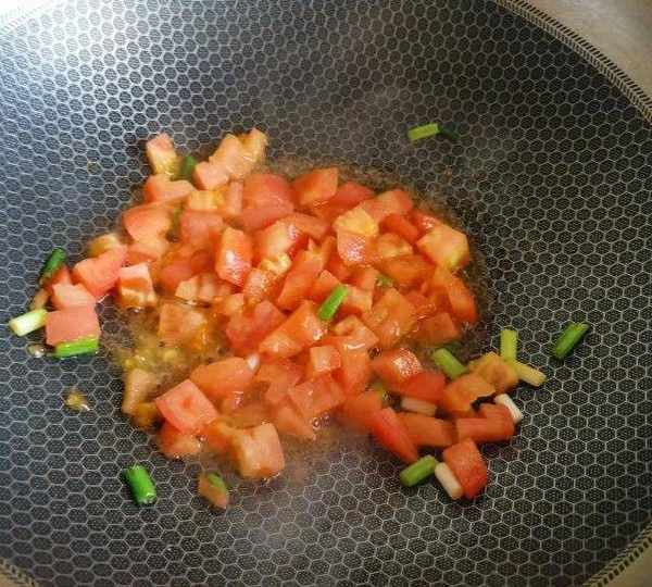 第7步、下入西紅柿煸炒出湯。