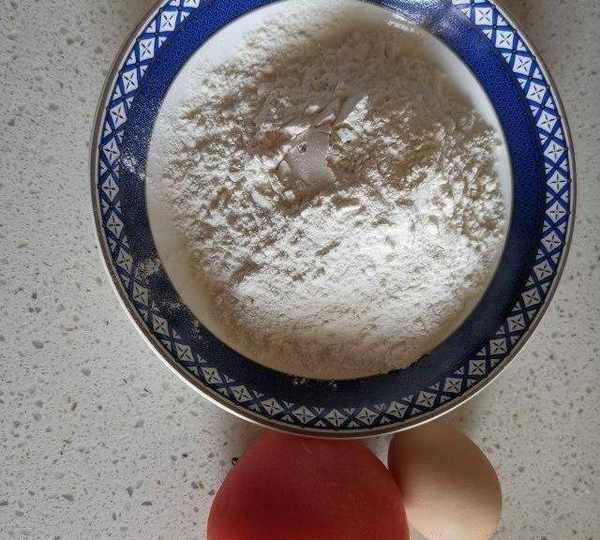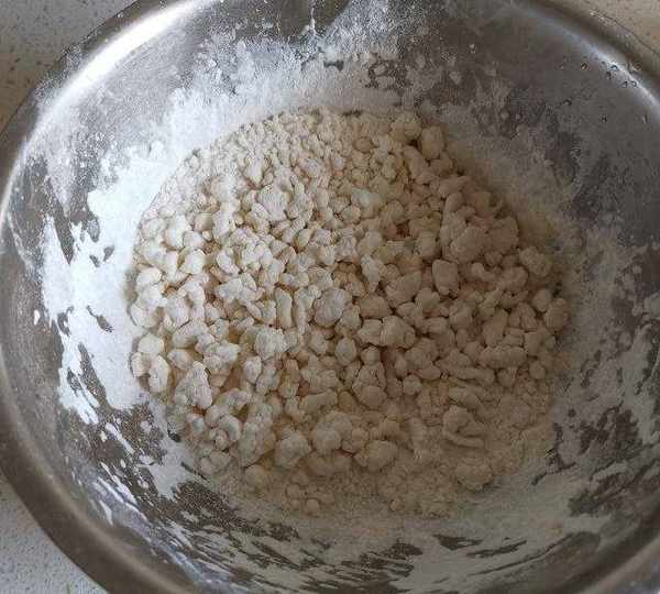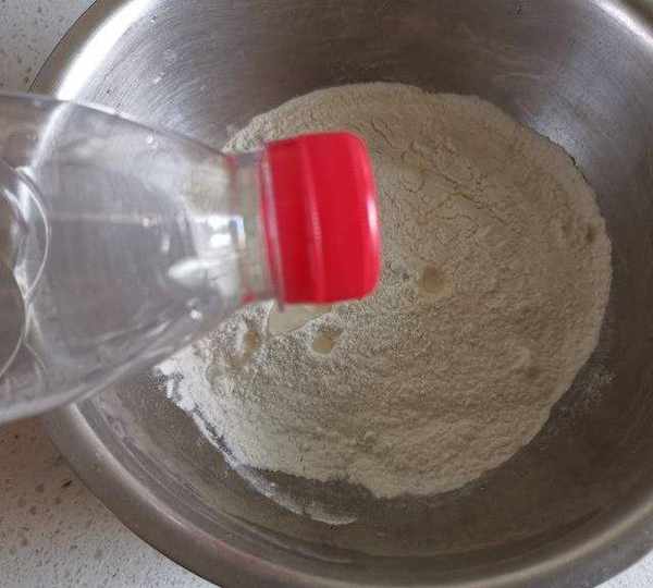 第2步、面粉倒入盆中,準備一個礦泉水瓶子,蓋子上紮幾個小眼,捏住往面粉裡噴灑水,邊噴水邊晃動盆子。