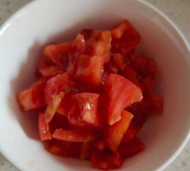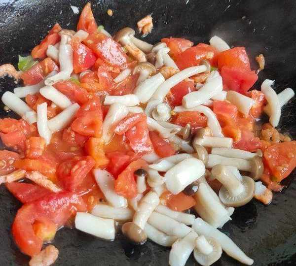 第7步、放入西紅柿丁翻炒片刻,再把炒好的蟹味菇放進去一起翻炒均勻。