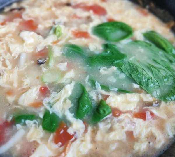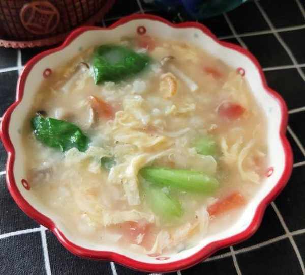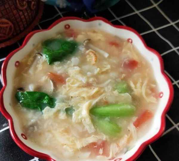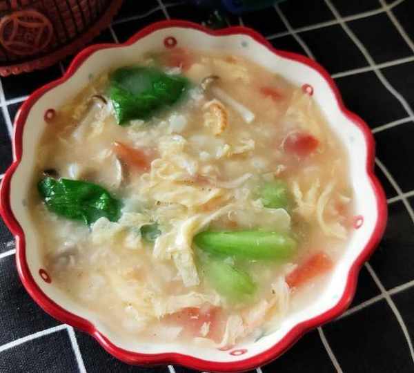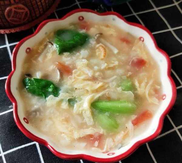 原料:普通面粉、西紅柿、蟹味菇、小油菜、雞蛋、蔥、鹽、蝦皮、玉米油、雞精、薑末。